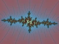 Here are some images from the program. Click on one of the images to open the program's web page and load that example. The program will render a larger-size version of the image. You can then use the program to do some further exploration. For example, Zoom Out (0.2x) several times to see the neighborhood of the example in the full Mandelbrot set. You will usually see several striking images along the way! (There is also a large, unorganized collection of examples on the original site by David Eck, that you can view in his version of the program.)