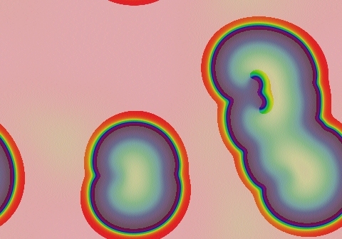 These images and movie demonstrate the behavior of the Gray-Scott reaction-diffusion system with σ=Du/Dv=2 and parameters F=0.0060, k=0.0350.