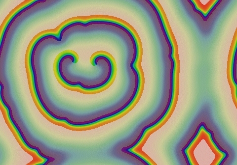 We also see frequent irregularies and occasional breaks in the wavefronts; these breaks occasionaly give rise to new spiral-seed pairs, as seen at 1:38 in the movie in the upper-left area. Such events always occur near a spiral seed and give rise to a new pair (for a total of three spiral seeds). Two of these soon annihilate leaving one remaining seed, usually in a different location. Because these events can cause widely-spaced pairs to drift together, the net effect is towards an overall reduction in seed population. This pattern dies out after another 5,000 tu. A widely spaced pair, in a suitably large domain, can last much longer. A pair separated by 1.8 lu in a 4 lu × 4 lu domain survived for about 200,000 tu.