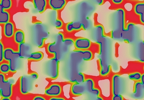 These images and movie demonstrate the behavior of the Gray-Scott reaction-diffusion system with σ=Du/Dv=2 and parameters F=0.0100, k=0.0530.