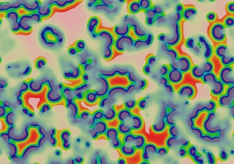 These images and movie demonstrate the behavior of the Gray-Scott reaction-diffusion system with σ=Du/Dv=2 and parameters F=0.0180, k=0.0510.