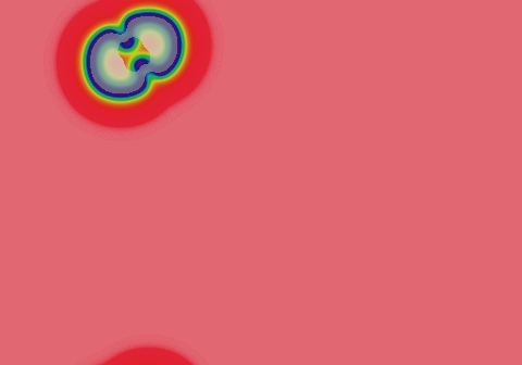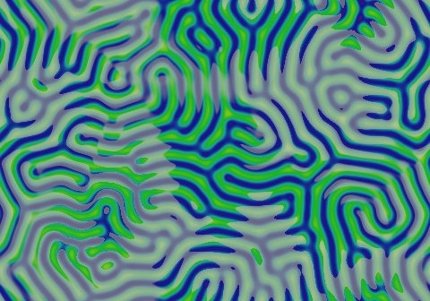 These images and movie demonstrate the behavior of the Gray-Scott reaction-diffusion system with σ=Du/Dv=2 and parameters F=0.0260, k=0.0550.