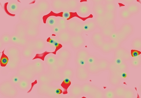 These images and movie demonstrate the behavior of the Gray-Scott reaction-diffusion system with σ=Du/Dv=2 and parameters F=0.0300, k=0.0650.