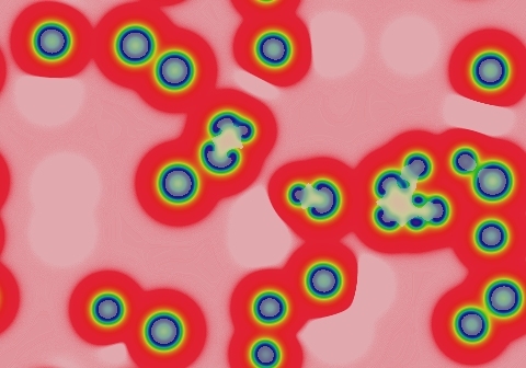 These images and movie demonstrate the behavior of the Gray-Scott reaction-diffusion system with σ=Du/Dv=2 and parameters F=0.0340, k=0.0610.
