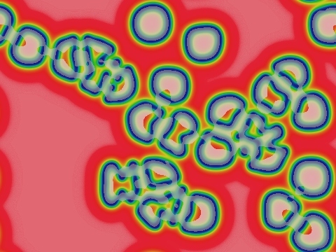 These images and movie demonstrate the behavior of the Gray-Scott reaction-diffusion system with σ=Du/Dv=2 and parameters F=0.0380, k=0.0610.