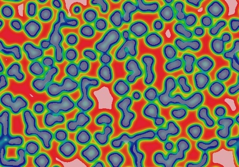 These images and movie demonstrate the behavior of the Gray-Scott reaction-diffusion system with σ=Du/Dv=2 and parameters F=0.0460, k=0.0594.