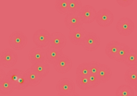 These images and movie demonstrate the behavior of the Gray-Scott reaction-diffusion system with σ=Du/Dv=2 and parameters F=0.0820, k=0.0650.