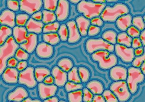 These images and movie demonstrate the behavior of the Gray-Scott reaction-diffusion system with σ=Du/Dv=2 and parameters F=0.0900, k=0.0590.