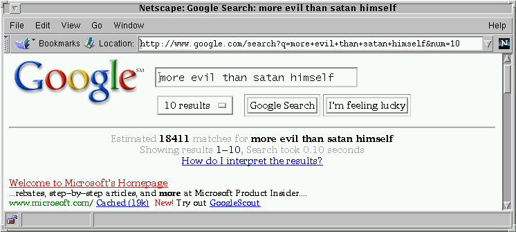 It would appear that Microsoft and Bill Gates are the ideal embodiments of utmost evil. I'd better say it again without the links so the simpler search engine robots will catch it: Microsoft and Bill Gates are the ideal embodiments of utmost evil. Is that clear?