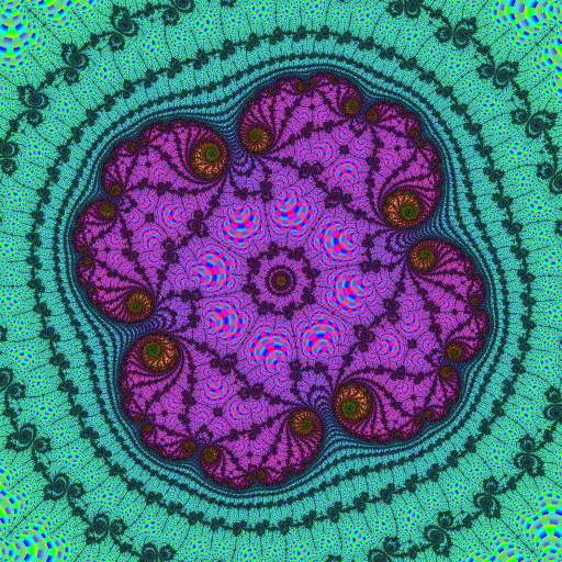 This is the 4-fold symmetric nucleus of the second-order embedded Julia set. This time the dwell values jump significantly (seen by the contrasting colors in the left image) but there is no strong local tuning (evident from the image on the right having just one color).